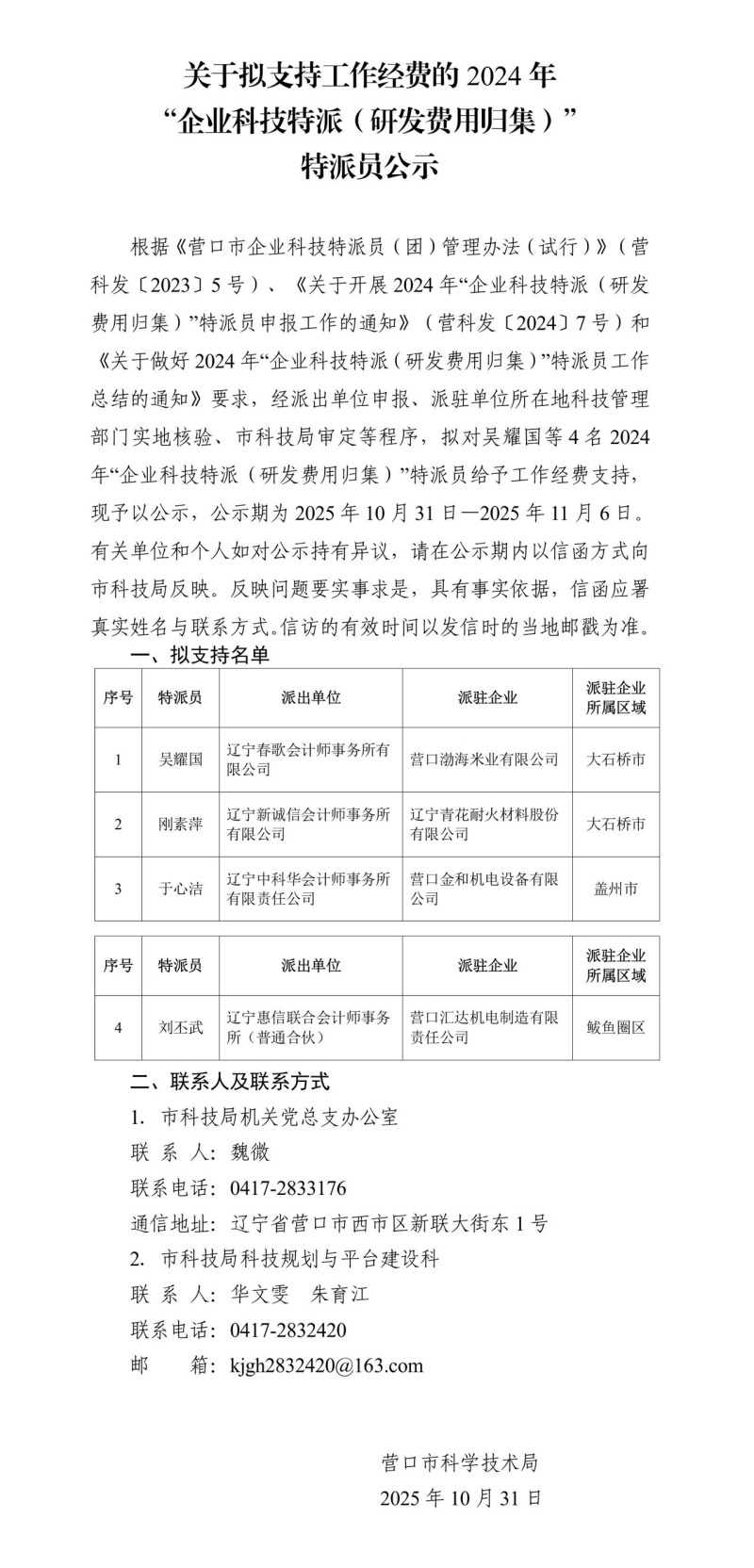 关于拟支持工作经费的2024年“企业科技特派(研发费用归集)”特派员公示