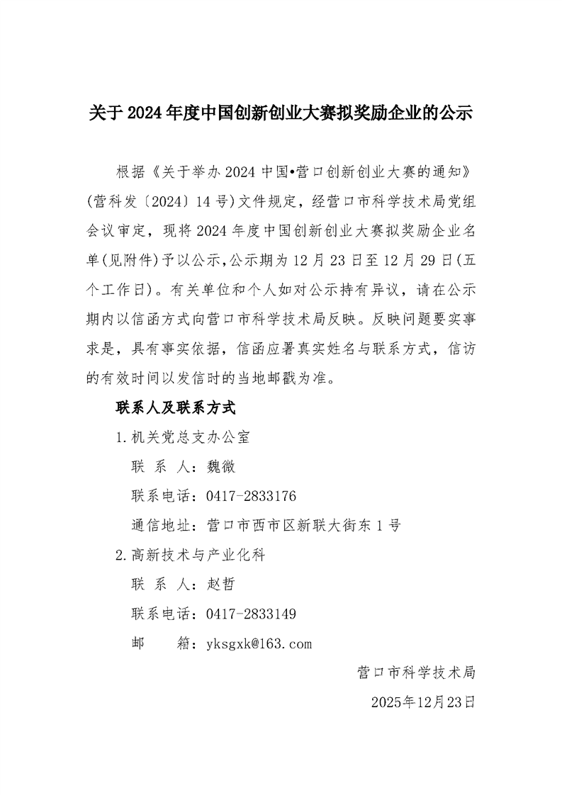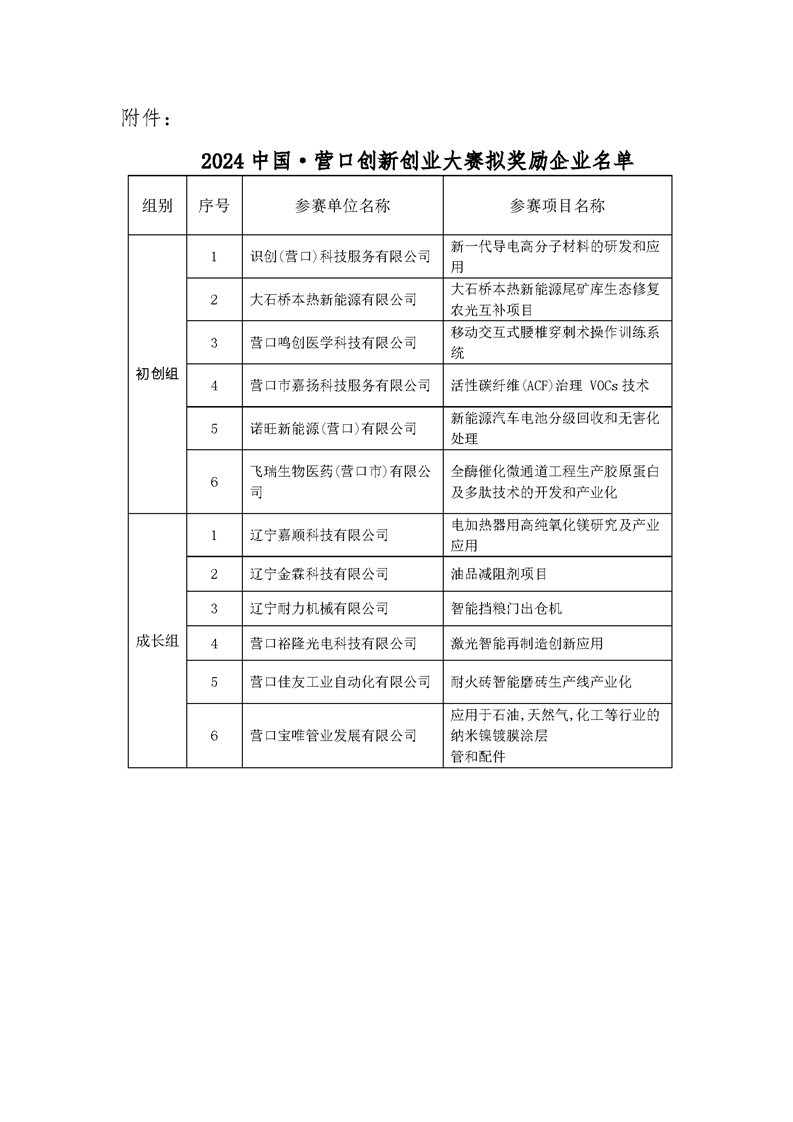 关于2024年度中国创新创业大赛拟奖励企业的公示