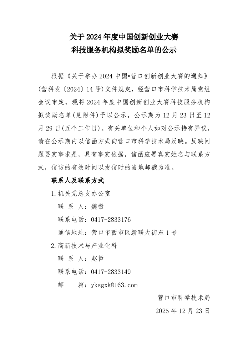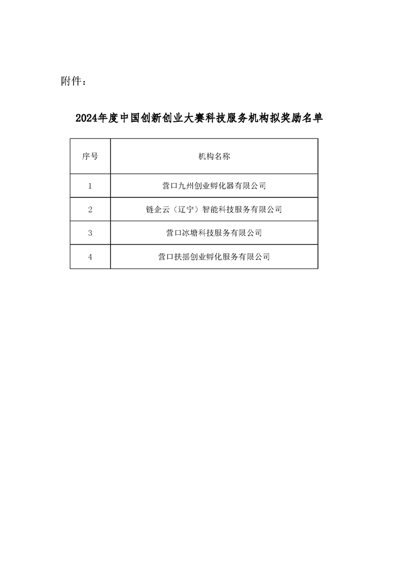 关于2024年度中国创新创业大赛科技服务机构拟奖励名单的公示