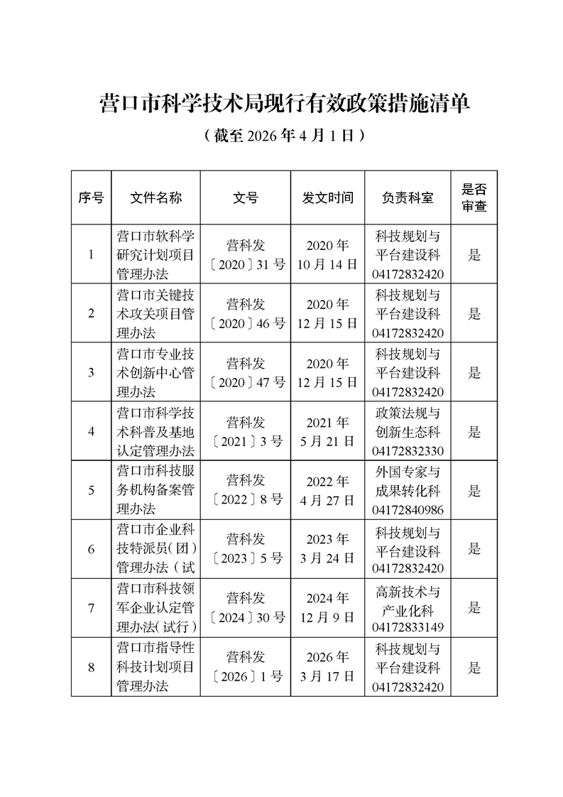 营口市科学技术局现行有效政策措施清单(截至2026年4月1日)