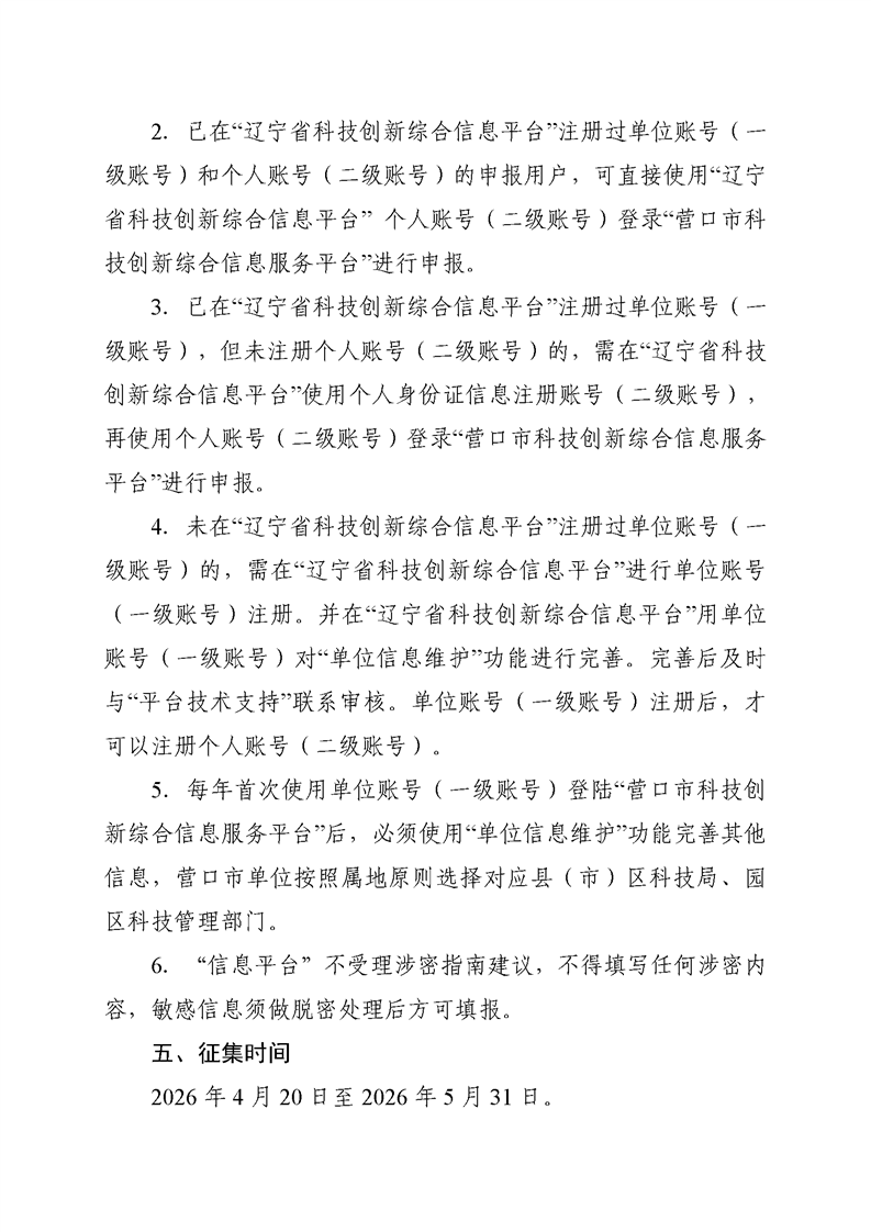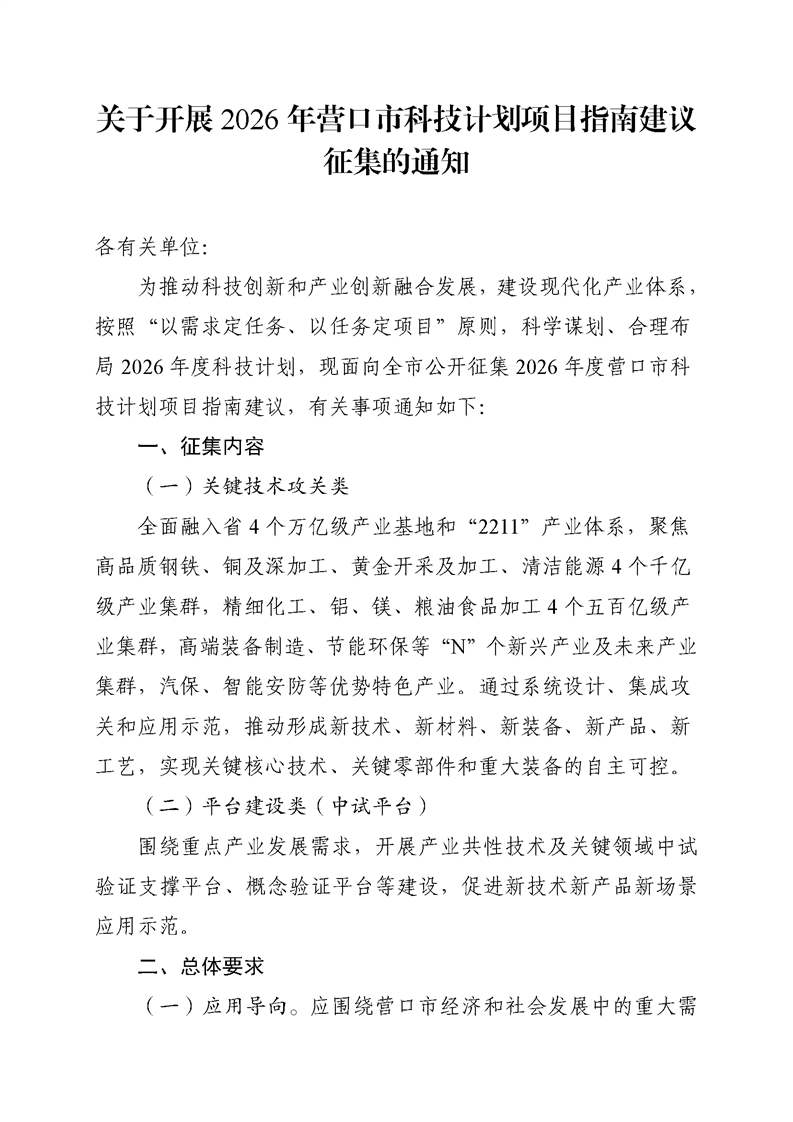 关于开展2026年营口市科技计划项目指南建议征集的通知